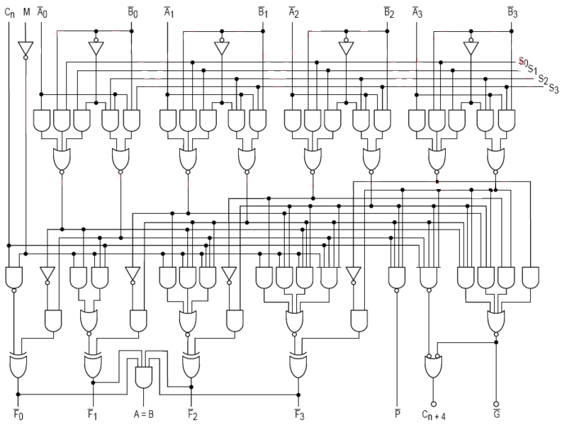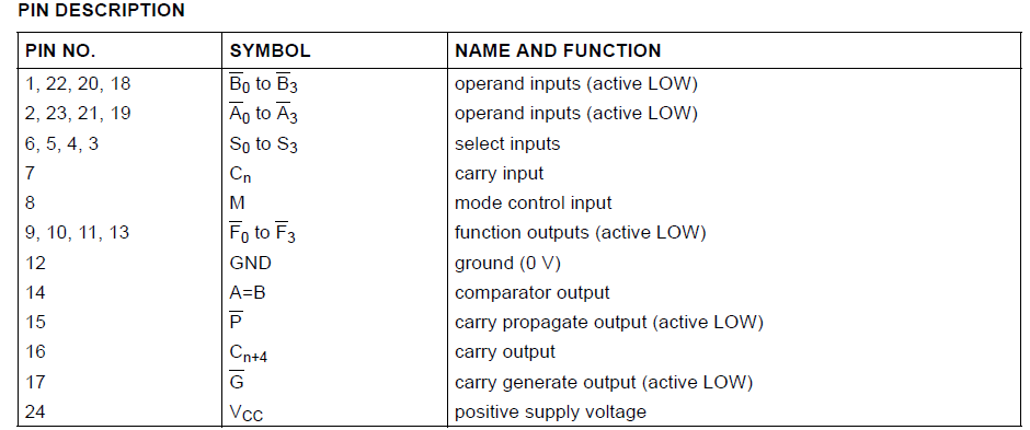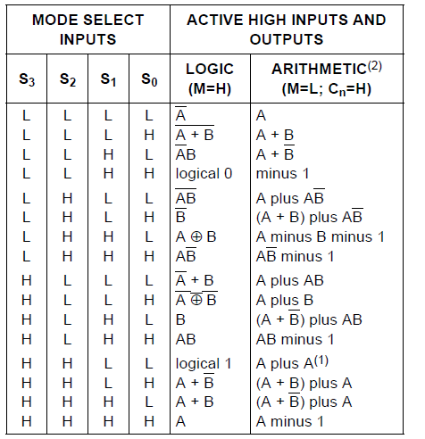 The function table list the arithmetic operation that are performed without a carry in.An incoming carry adds a one to each operation.Thus the select code LHHS generates A minus B minus 1 (2s compliment notation) without a carry in and and generates A minus B when a carry is applied. Because subtraction is actually performed by complimentry addition (1s compliment),a carry out means borrow;thus a carry is generated when there is no under flow and no carry is generated when there is underflow.As indicated this device can be used with either active low inputs producing active low outputs or with ative high inputs producing active active high outputs.For either cause the table lists the operations that are performed to operends labled inside the logic symbol.