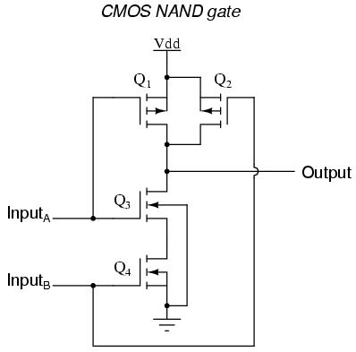 More complex logic functions such as those involving AND and OR gates require manipulating the paths between gates to represent the logic. When a path consists of two transistors in series, both transistors must have low resistance to the corresponding supply voltage, modeling an AND. When a path consists of two transistors in parallel, either one or both of the transistors must have low resistance to connect the supply voltage to the output, modeling an OR. Shown on the right is a circuit diagram of a NAND gate in CMOS logic. If both of the A and B inputs are high, then both the NMOS transistors (bottom half of the diagram) will conduct, neither of the PMOS transistors (top half) will conduct, and a conductive path will be established between the output and Vss (ground), bringing the output low. If either of the A or B inputs is low, one of the NMOS transistors will not conduct, one of the PMOS transistors will, and a conductive path will be established between the output and Vdd (voltage source), bringing the output high.