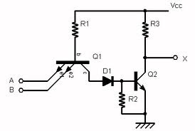 In the above diagram if any input is low, the corresponding base-emitter junction becomes forward-biased and the transistor conducts.